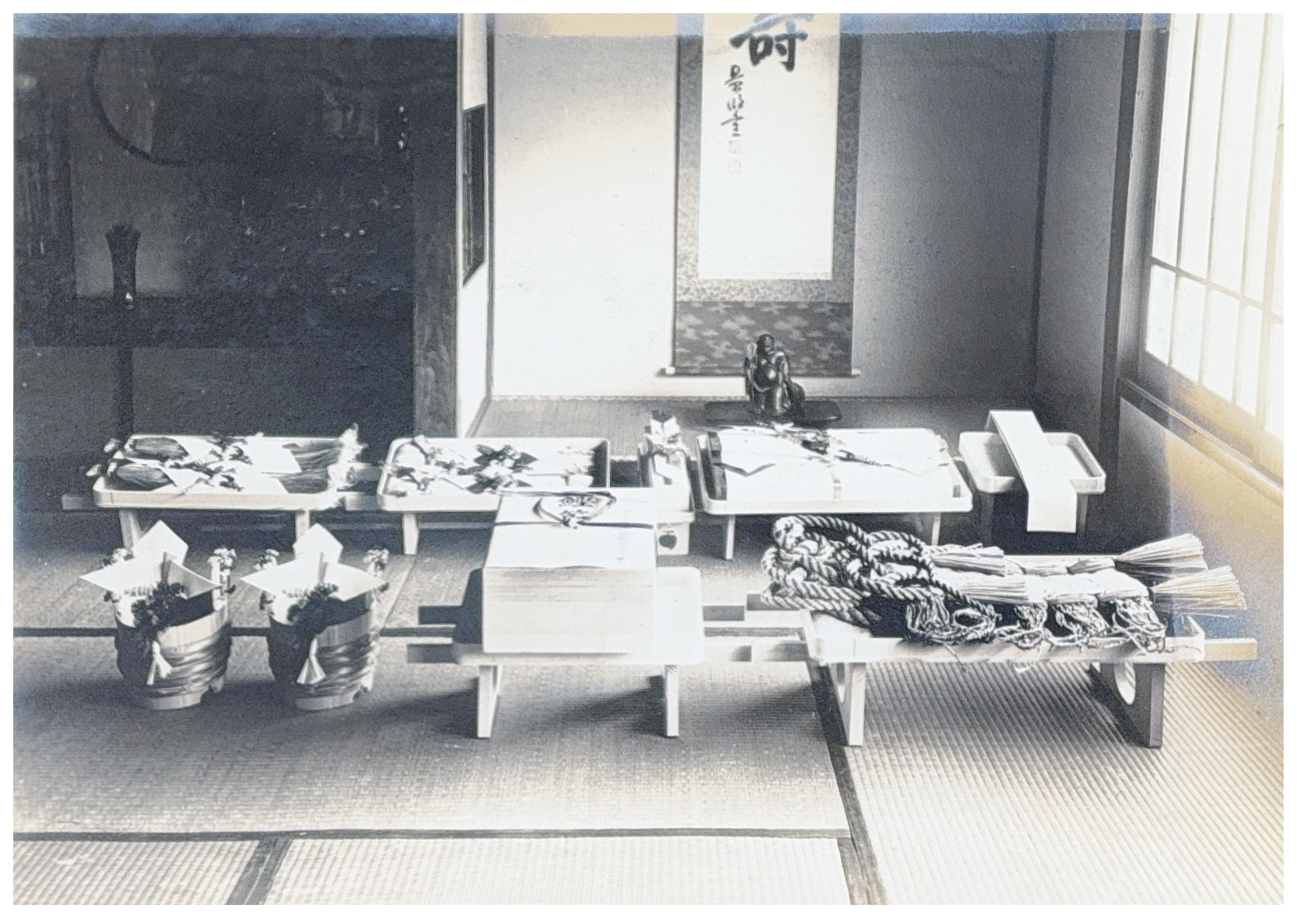 昭和30年代の関東の結納風景です。結納はご両家の結びつきの第一歩の大切な行事でです。